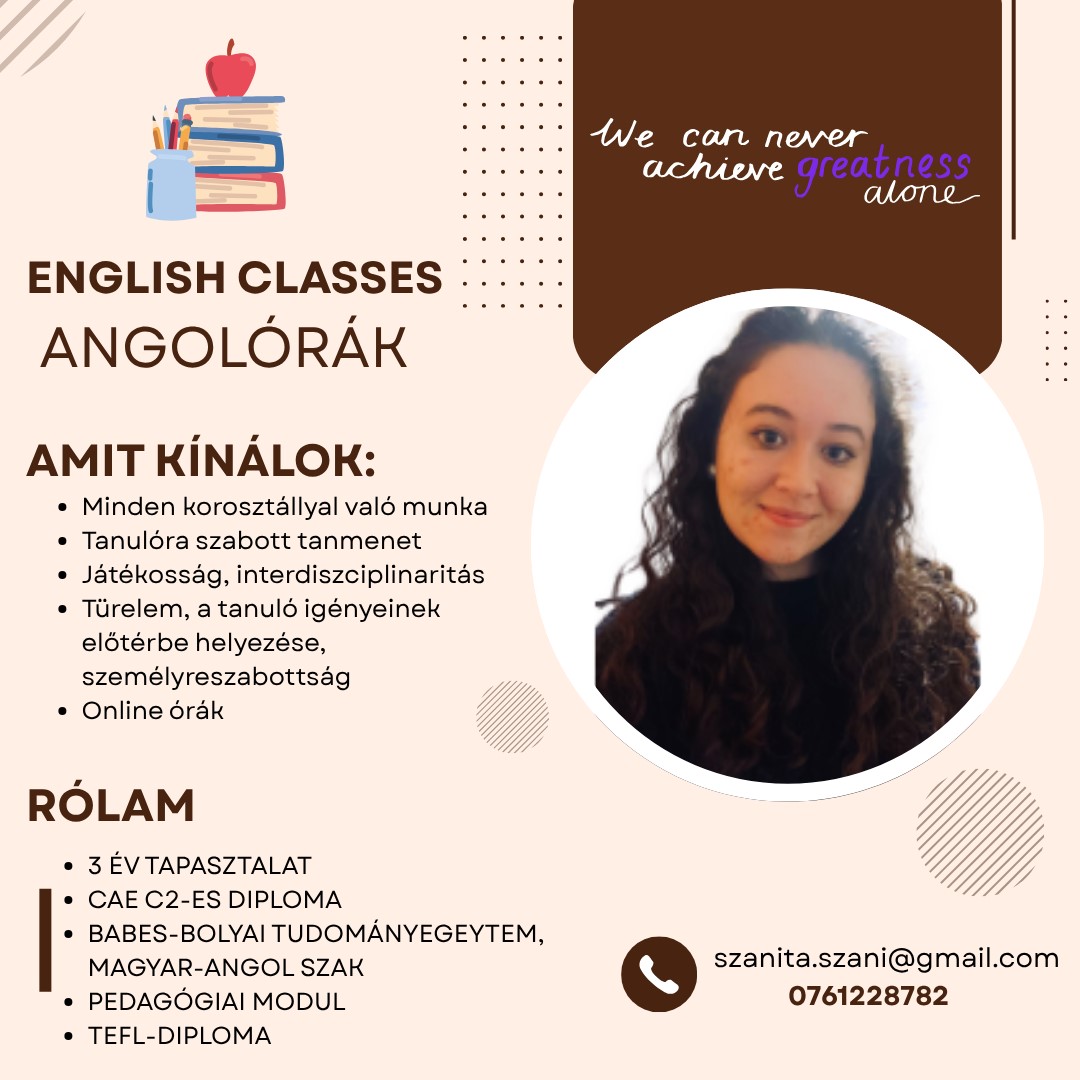 A kolozsvári Babeș–Bolyai Tudományegyetemen magyar–angol szakot végeztem, és jelenleg is itt folytatom a mesteri tanulmányaimat. Cambridge CAE C2-es diplomával, TEFL-diplomával (Teaching English as a Foreign Language), valamint pedagógiai modullal is rendelkezem. Szenvedélyem az angol nyelv, és nagyon szívesen segítenék olyanoknak, akik szeretnének feljebb jutni a nyelvtanulás létrájának fokain. Három év tapasztalatom van magánórák terén, de iskolában is tanítottam már.